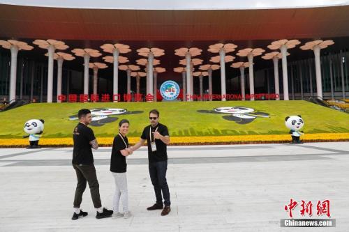 11月4日,参展商在国家会展中心南广场上,与中国国际进口博览会吉祥物合影留念。5日,首届中国国际进口博览会在上海的国家会展中心开幕。中新社记者 殷立勤 摄