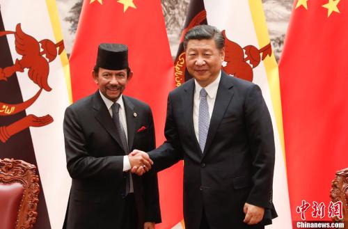 资料图:2017年9月13日,中国国家主席习近平在北京人民大会堂同文莱苏丹哈桑纳尔举行会谈。会谈后,两国元首共同见证了两国“一带一路”建设、基础设施建设、卫生等领域双边合作文件的签署。中新社记者 杜洋 摄