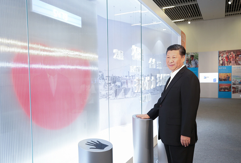2017年6月26日,中共中央总书记、国家主席、中央军委主席习近平在国家博物馆参观香港回归祖国20周年成就展。这是习近平按下“同心圆”互动装置触摸板。这个“同心圆”互动装置代表香港同胞和内地同胞齐心协力、携手合作,一起为国家发展贡献力量。新华社记者 姚大伟 摄