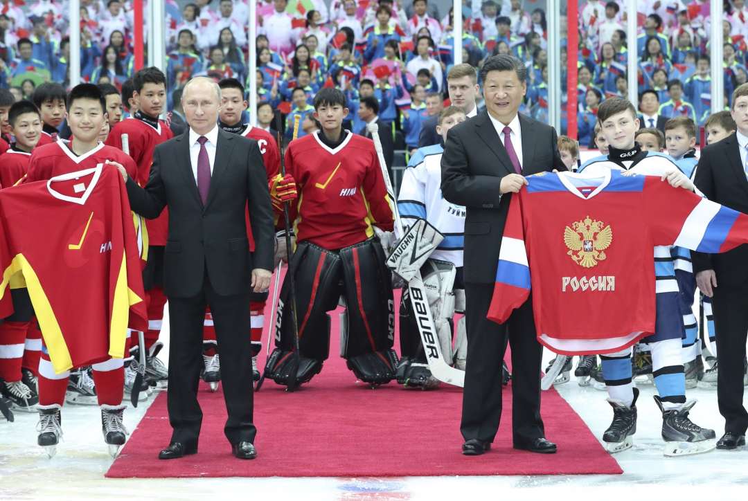 2018年6月8日,俄罗斯总统普京来华进行国事访问。在忙完欢迎仪式、小范围、大范围会谈,共见记者等活动后,习近平和普京马不停蹄,从人民大会堂直接奔赴北京南站搭乘动车。19时40分许,习近平与普京一同出现在天津体育馆,共同观看中俄青少年冰球友谊赛。