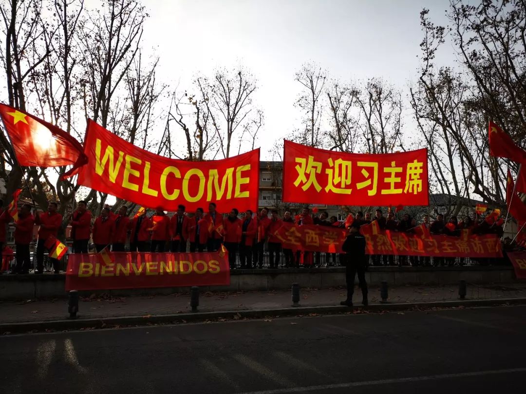 △欢迎人群手持中西两国国旗和欢迎标语。(央视记者张晓鹏拍摄)