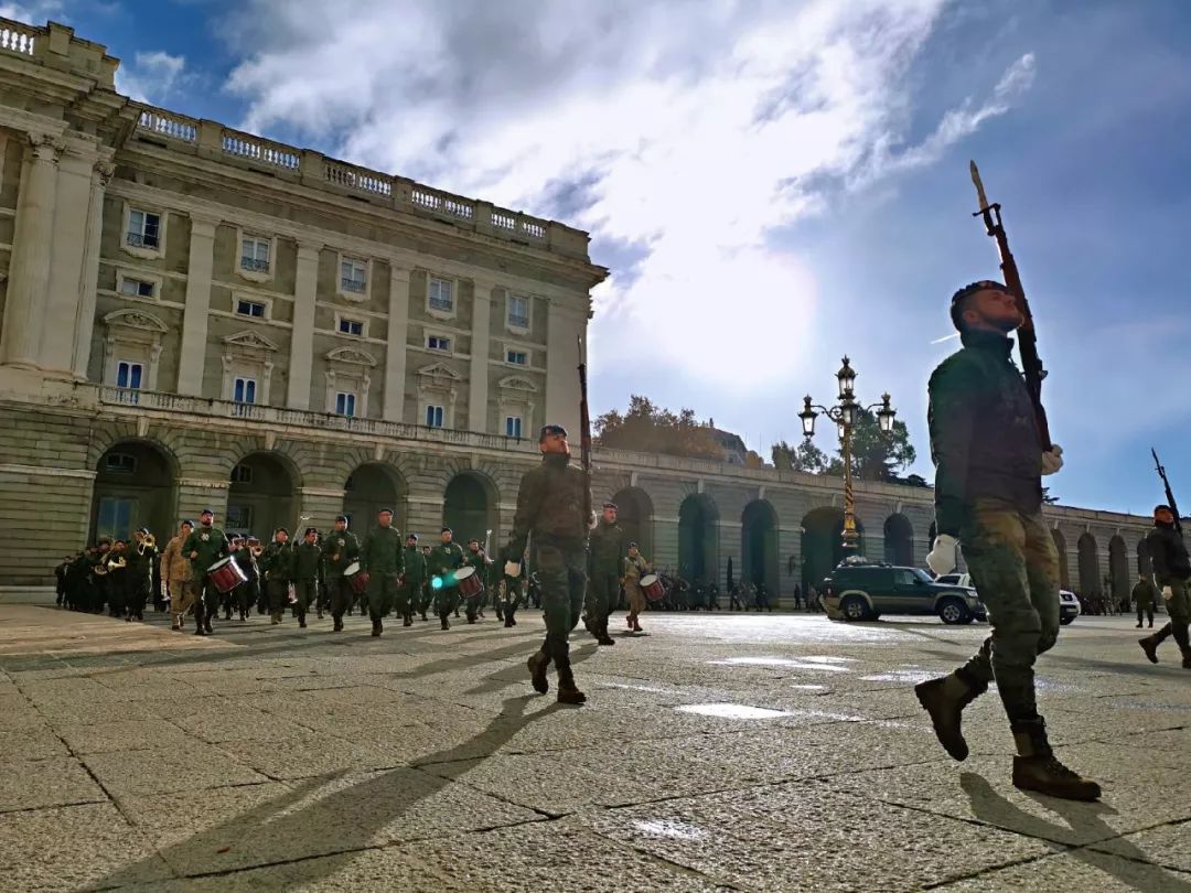 △西班牙皇家卫队在进行欢迎仪式分列式演练。(央视记者张晓鹏拍摄)