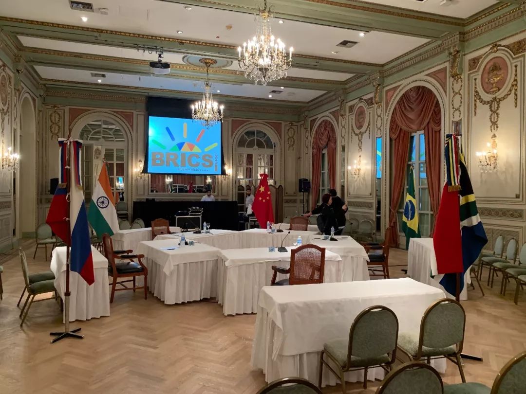 △这是当天上午举行会晤前的会场。看到这个会标是不是有些眼熟?四个多月前,金砖五国领导人刚刚在约翰内斯堡举行会晤。(央视记者邓睿拍摄)