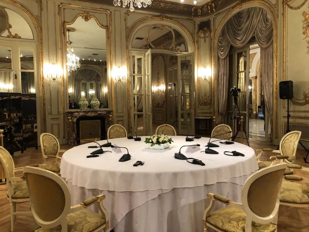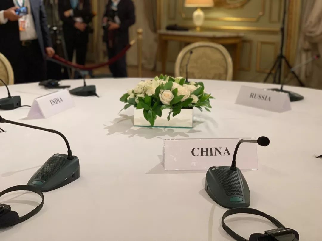 △中俄印领导人就是在这张桌子上举行非正式会晤。(央视记者马亚阳拍摄)