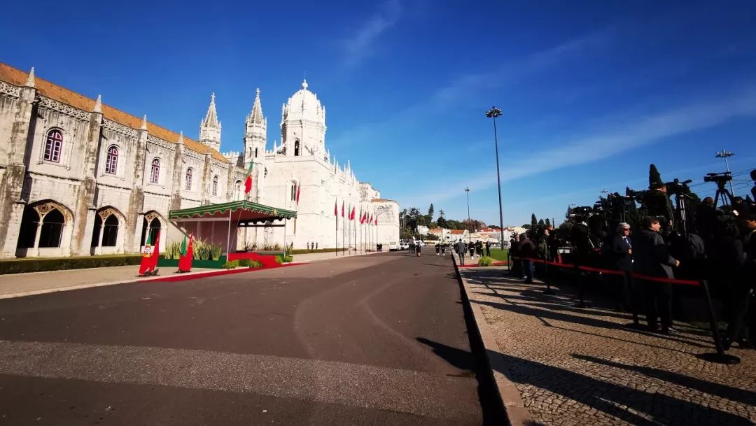 欢迎仪式结束后,习近平来到帝国广场旁的圣玛利亚贝伦教堂,为卡蒙斯墓献花环。