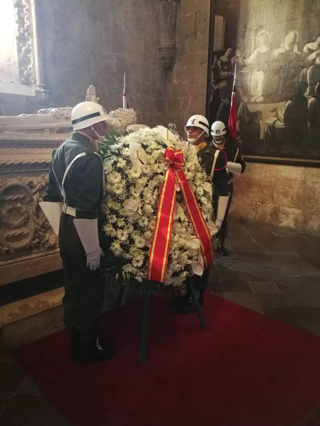 △葡萄牙礼兵将习近平献给卡蒙斯墓的花环置于陵墓前。(央视记者钟锐拍摄)