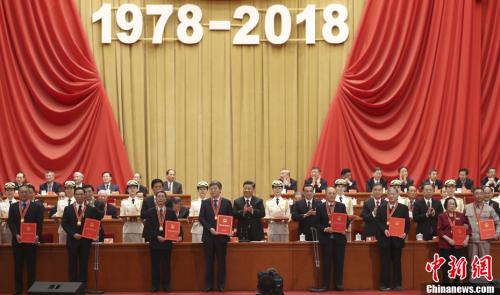 12月18日,庆祝改革开放40周年大会在北京隆重举行。图为中共中央总书记、国家主席、中央军委主席习近平等为获得改革先锋称号人员代表颁奖。中新社记者 盛佳鹏 摄