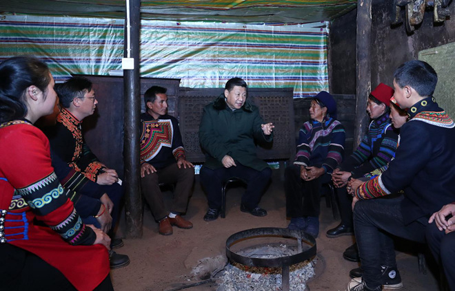 2018年2月11日上午,习近平在凉山彝族自治州昭觉县三岔河乡三河村节列俄阿木家中同村民代表、驻村扶贫工作队员围坐火塘边,共谋精准脱贫之策。新华社记者 鞠鹏 摄