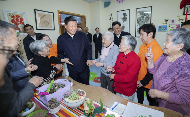 “老龄问题是中央最关心的问题之一”。2018年11月6日,习近平走进上海虹口区市民驿站嘉兴路街道第一分站,逐一察看综合服务窗口、托老所等。老人们激动地握着总书记的手,向总书记讲述自己的幸福晚年。总书记和一位独居老人握了三次手。