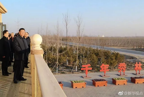 雄安新区坚持生态优先、绿色发展,率先启动生态基础设施建设和环境整治,目前已完成11万亩“千年秀林”建设。16日下午,习近平总书记来到“千年秀林”大清河片林一区造林区域,乘车穿行林区察看林木长势,登上秀林驿站二层平台远眺林区全貌,同当地护林员代表亲切交流。他说,蓝天、碧水、绿树,蓝绿交织,将来生活的最高标准就是生态好。雄安新区过去有一定的基础,现在搞“千年秀林”,将来这里一定是最宜居的地方。绿水青山就是金山银山,雄安新区就要靠这样的生态环境来体现价值、增加吸引力。