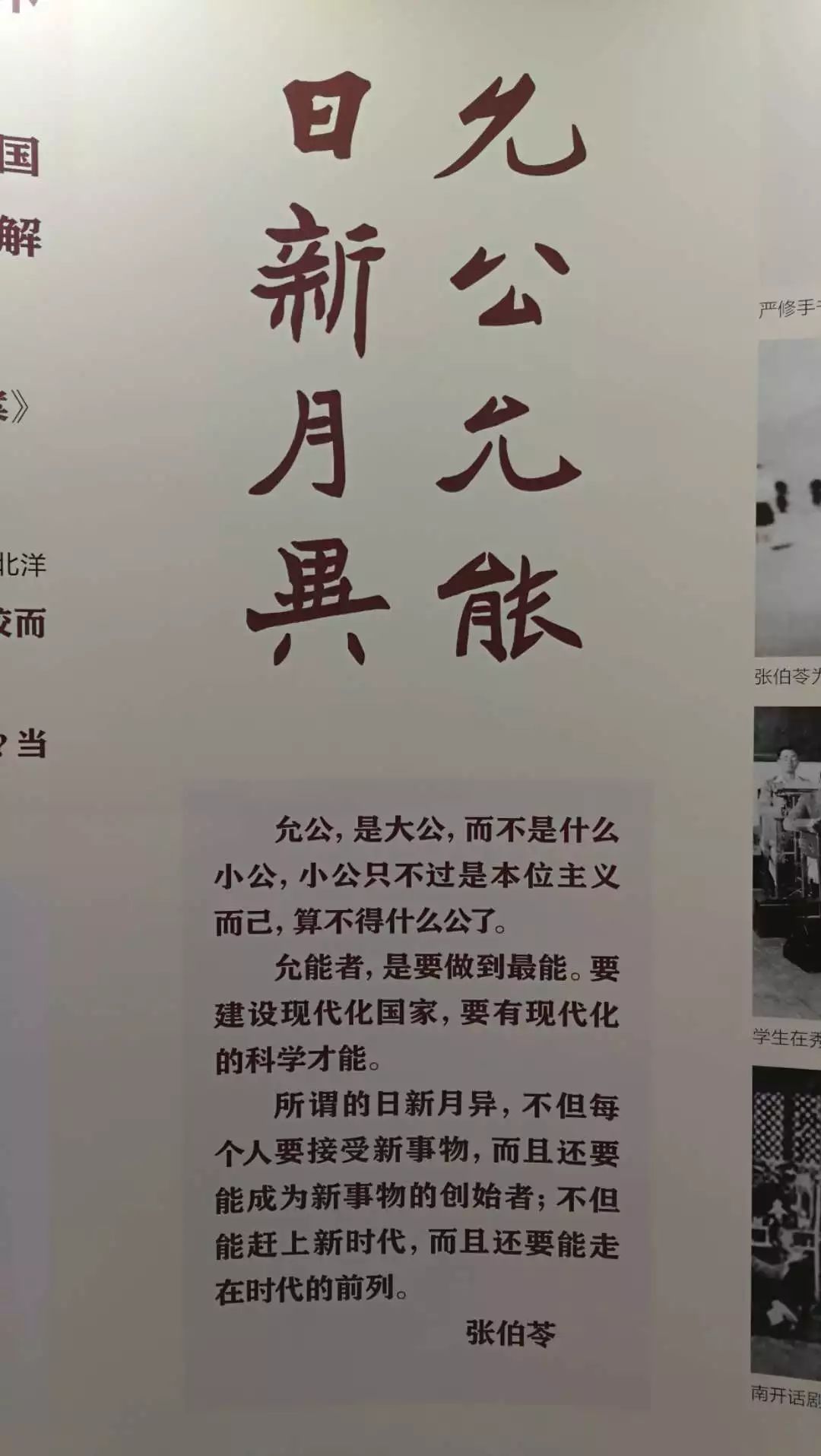 △校史主题展展板。张伯苓校长在1935年南开大学开学典礼上所问的三个问题——“张伯苓三问”。(央视记者石伟明拍摄)