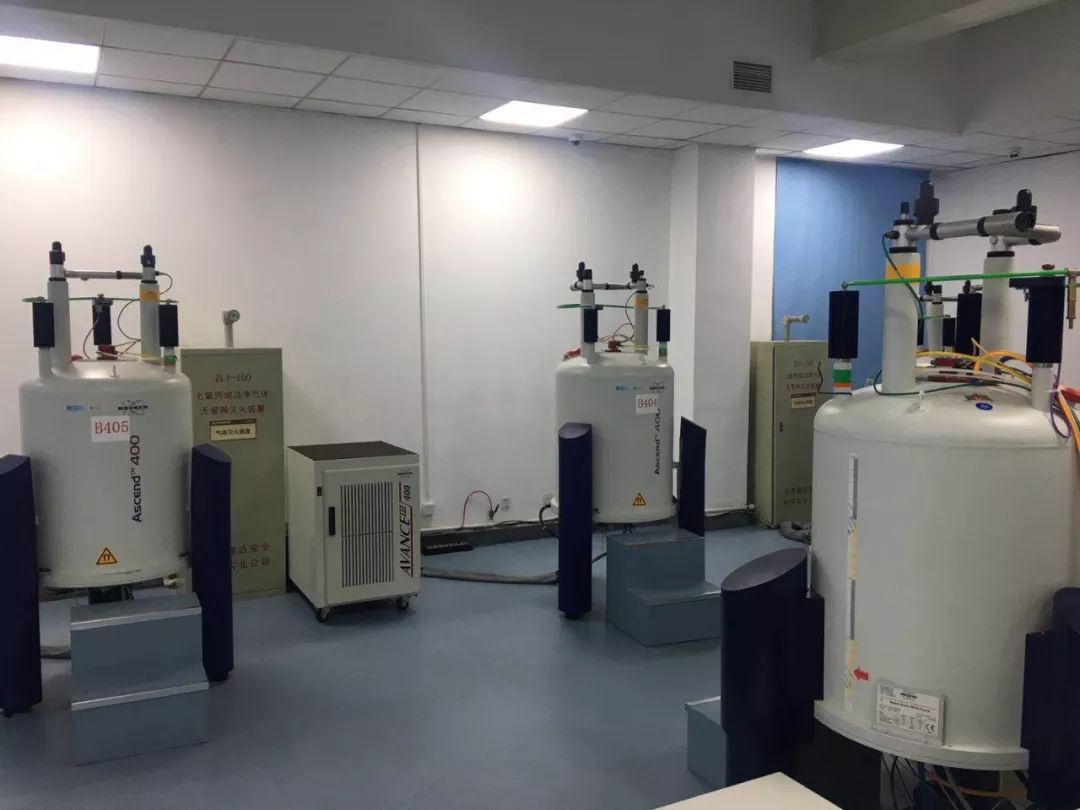 △在习近平参观的这间实验室中,这些白色罐子是核磁共振波谱仪。它利用超导产生的强大磁场可以提供从有机小分子到生物大分子的组成与结构信息,是化学、材料学和生命科学研究者必不可少的研究手段之一。(央视记者李辉拍摄)