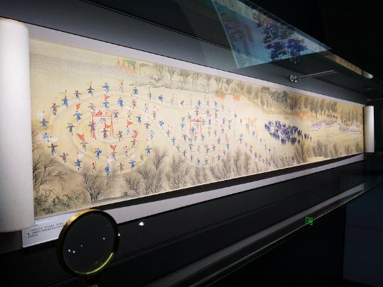 △冰嬉图是清朝乾隆年间的宫廷绘画。长5米,宽30余厘米,展现中国传统运动冰嬉的场面。(央视记者魏建拍摄)