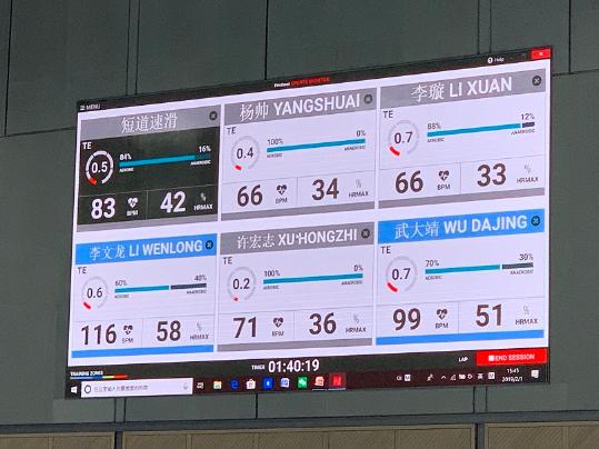 △速滑训练馆大屏幕上实时显示的是运动员的心率信息,可以帮助了解训练强度,为运动员制定个性化的训练计划。(央视记者李辉拍摄)