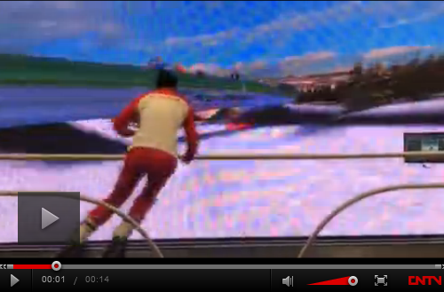 △中国高山滑雪集训队队员丛亮在利用高山滑雪模拟机训练。模拟机的屏幕上显示的是平昌冬奥会的回转场地。模拟机可以模拟真实滑雪场地的倾斜角度,有效训练高山滑雪的各项技术要点。(央视记者王哈男拍摄)