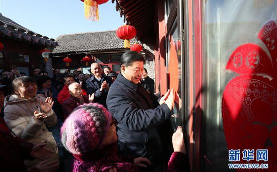 2月1日,中共中央总书记、国家主席、中央军委主席习近平在北京看望慰问基层干部群众,考察北京冬奥会、冬残奥会筹办工作。这是1日上午,习近平在前门东区草厂四条胡同32号院,高兴地拿起一幅“福”字,亲自贴到门上,给这里的老街坊们拜年。 新华社记者 鞠鹏 摄