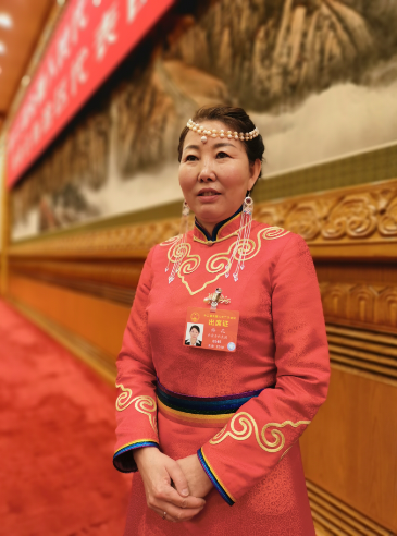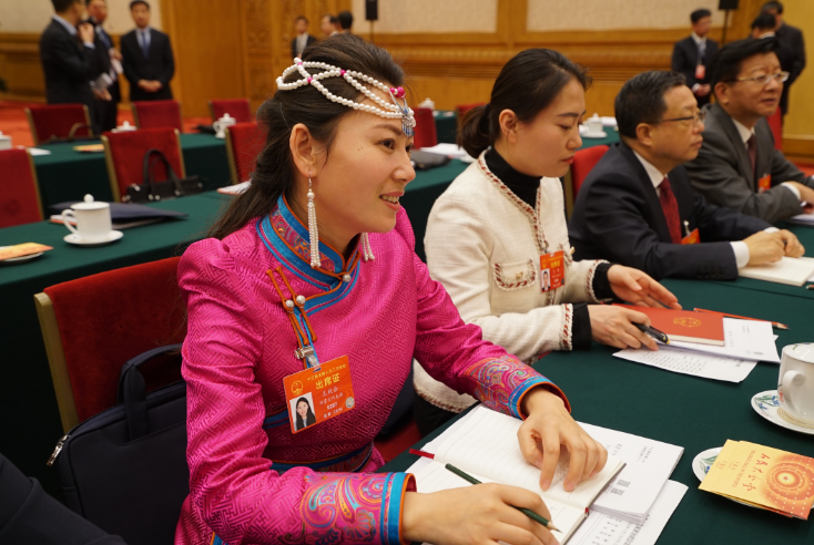 △习近平走进会场后,鄂温克族代表梅花向他献上了蓝色的哈达。这是梅花代表。(央视记者张晓鹏拍摄)