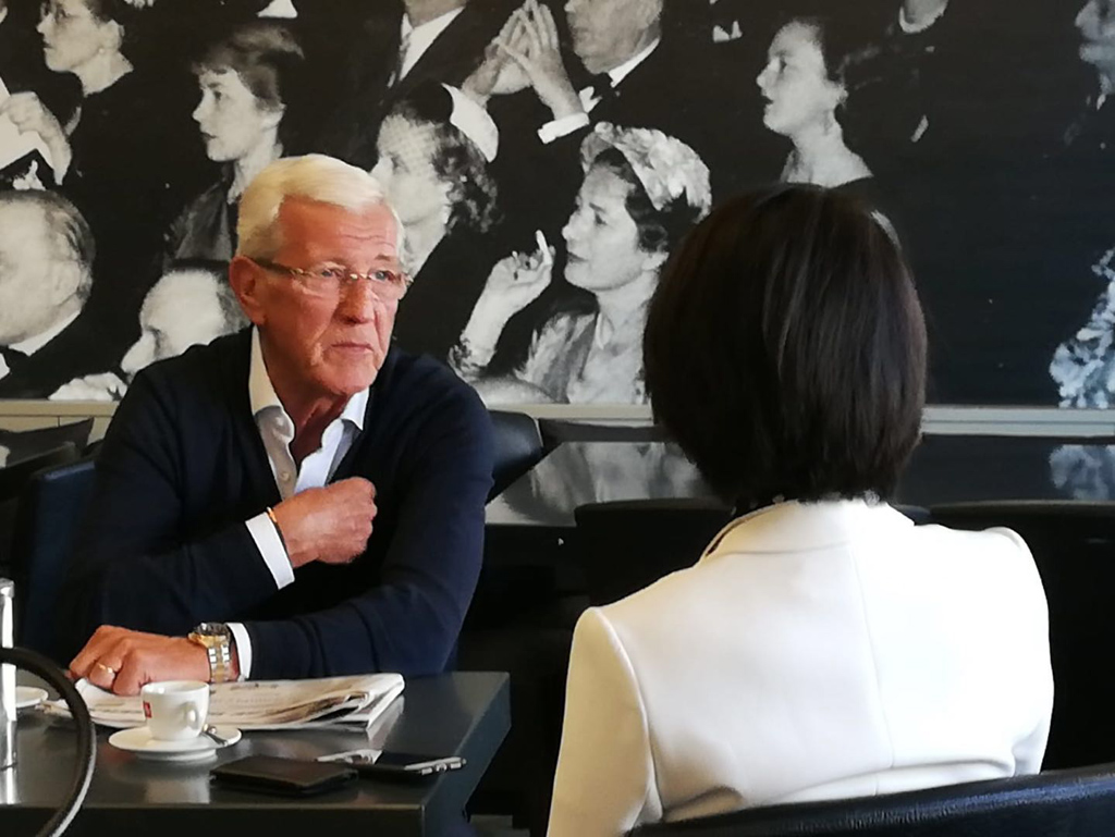 △中意双方将加强博物馆、地方、民间、体育等交流合作。中国国家男子足球队前主教练里皮这次接到意大利总统的邀请,出席了招待习主席的晚宴。谈到意大利与中国签署“一带一路”谅解备忘录,里皮把欧洲比作一个球队,他说作为主教练希望每个球员都好,所以欧洲也应该高兴。(央视记者陆幽提供)