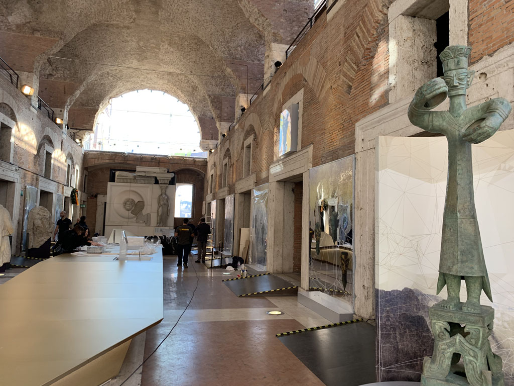 △“三星堆:人与神的世界——四川古蜀文明特展”即将在罗马展出,展览汇集了三星堆遗址、金沙遗址等文博机构的145件精美文物及复制品。这是工作人员正在布展。(央视记者张晓鹏拍摄)