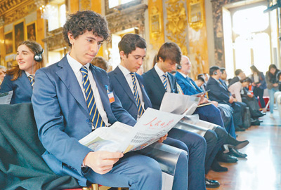 3月20日,意大利罗马国立住读学校学生阅读3月19日出版的人民日报。该期报纸刊登有习近平主席给该校师生的回信。