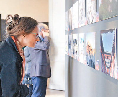 3月24日,“光影流年——中法友好故事会”在巴黎举行。图为法国观众欣赏中国风光摄影作品。