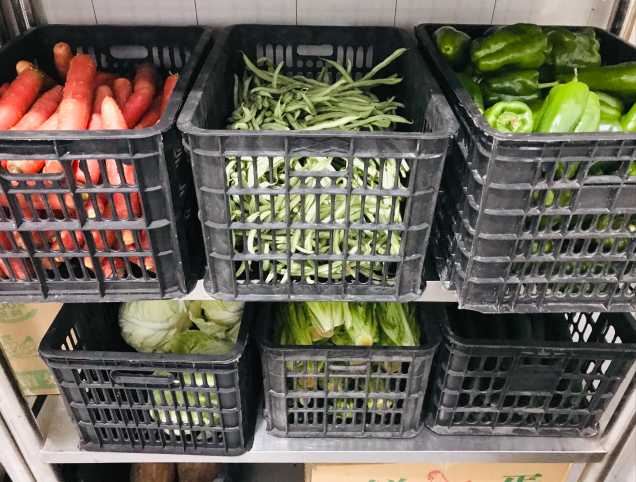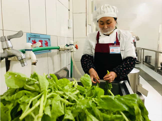 △当天晚餐的食谱是:牛肉炖萝卜、炒鸭子、炒小白菜、蒸鸡蛋、紫菜蛋汤。这是炊事员陈益淑正在洗小白菜。(央视记者拍摄)