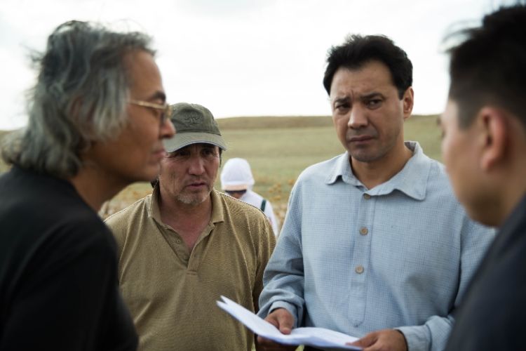 《音乐家》导演西尔扎提·牙合甫(左一)与哈方艺术指导萨比特·科曼贝科夫(左二)给饰演拜卡达莫夫的男演员别里克·艾特占诺夫(右二)说戏。