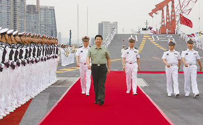 习近平一直十分关心我国第一艘航空母舰建设和部队训练。2013年8月28日上午,他一下飞机就冒着风雨来到海军某舰载机综合试验训练基地,观看舰载机滑跃起飞、阻拦着陆训练,实地察看有关设备。看到飞行员们干净利落完成了各项训练课目,习近平十分高兴,为他们热情鼓掌。习近平亲切接见了首批上舰指挥员、试飞员和舰载机飞行员,高度赞赏飞行员在复杂气象条件下表现出的过硬本领和精湛技艺。习近平还仔细听取了舰载机设计和性能介绍,要求有关科技人员认真分析战机试飞数据,不断攀登科技高峰。临别时,他勉励大家再接再厉、深入钻研、勤学精练,早日成为优秀的航母舰载机飞行员。