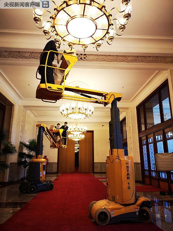 △下午两点,人民大会堂工作人员正在检修北大厅照明灯,确保外事活动的顺利举行。(央视记者史伟拍摄)