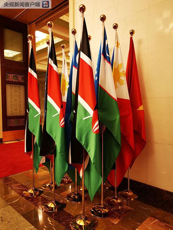 △人民大会堂北大厅南门外,上午几场双边活动的国旗在这里等候就位。(央视记者张晓鹏拍摄)