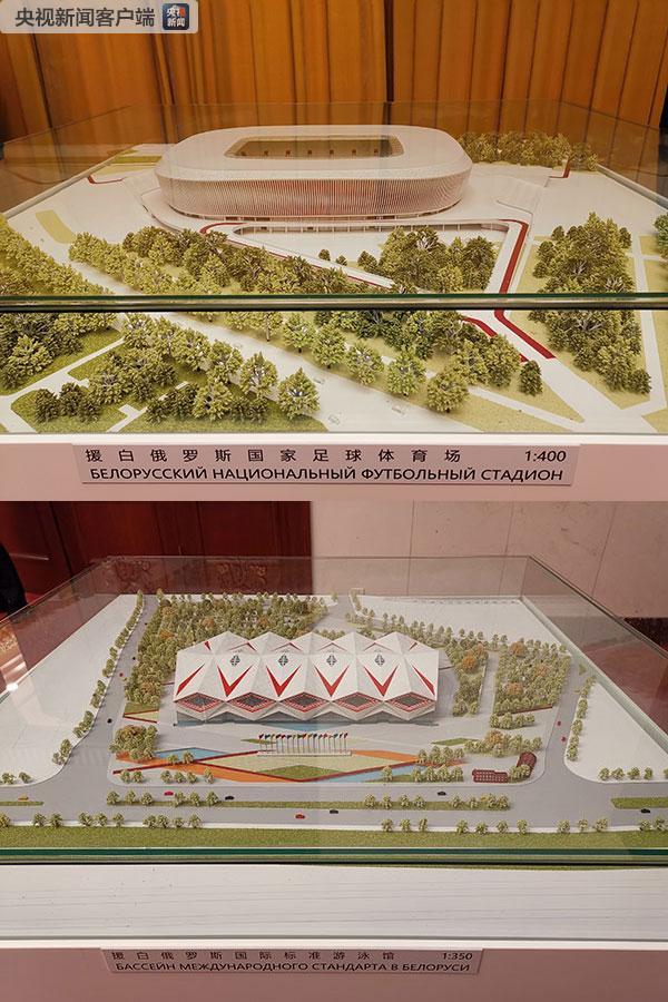 △当天,两国元首共同为中方援白体育场、游泳馆项目模型揭幕。这是两个项目的模型。(央视记者杨立峰拍摄)