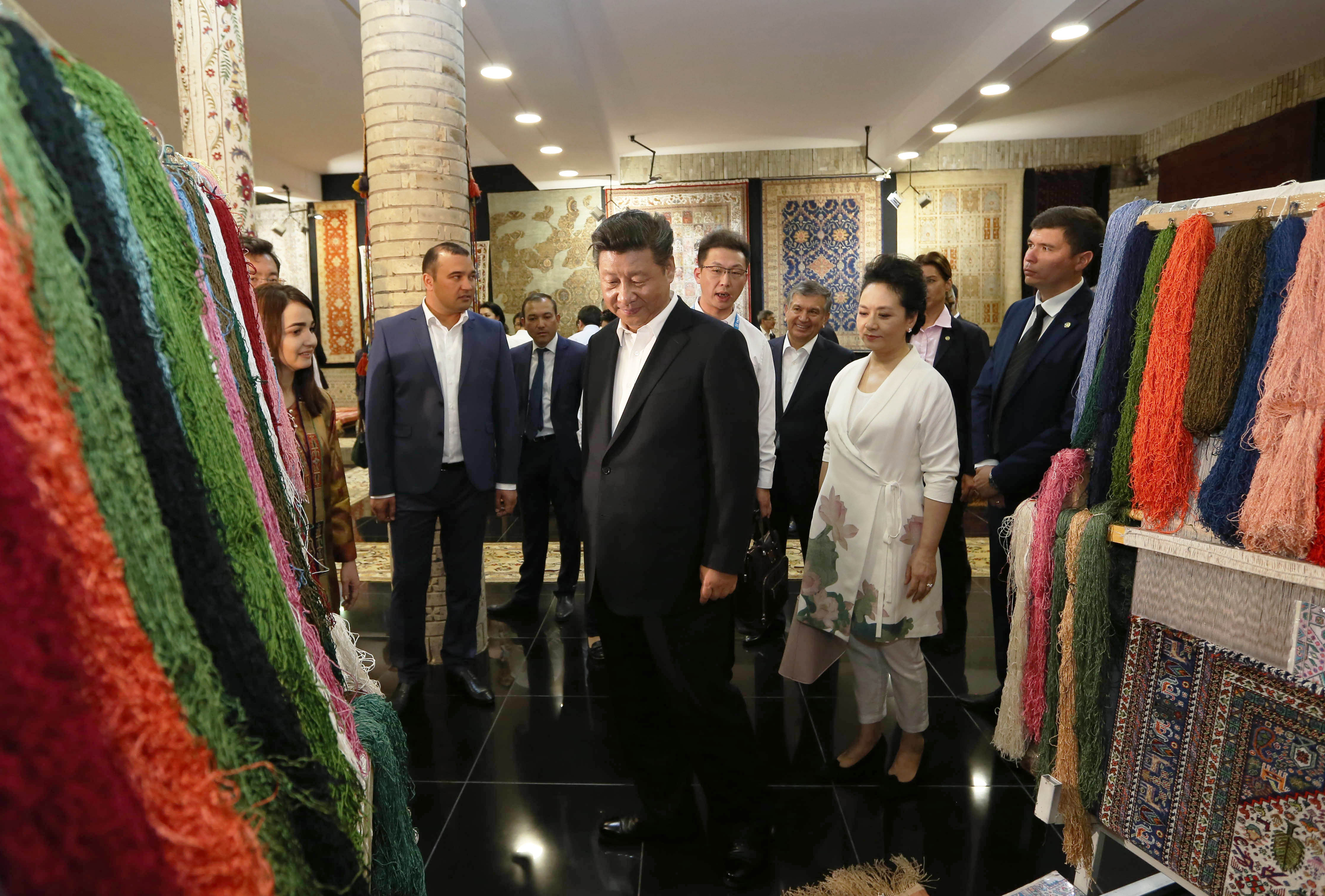 当地时间2016年6月21日下午,正在对乌兹别克斯坦进行国事访问的国家主席习近平来到被称为“丝绸之路活化石”的历史文化名城布哈拉。这是习近平和夫人彭丽媛参观一家地毯和丝绸作坊。