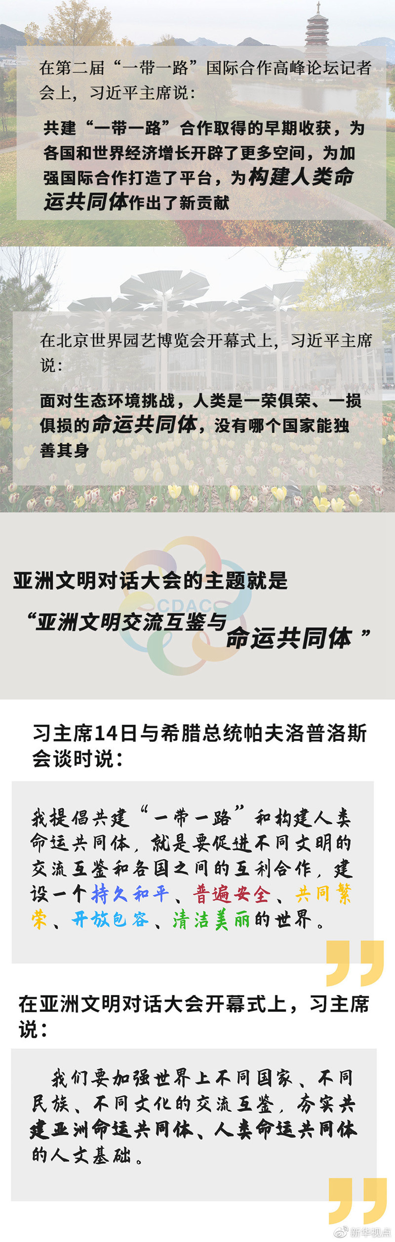 半个多月来,世界的目光一次次聚焦北京。从第二届“一带一路”国际合作高峰论坛,到2019年中国北京世界园艺博览会,再到亚洲文明对话大会,三场活动主题不同,却有一个关键词贯穿始终:命运共同体。