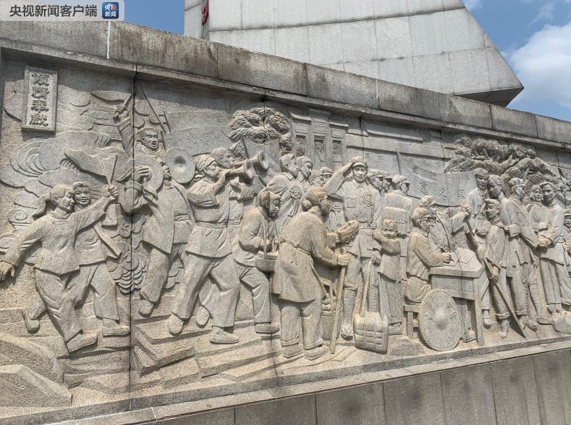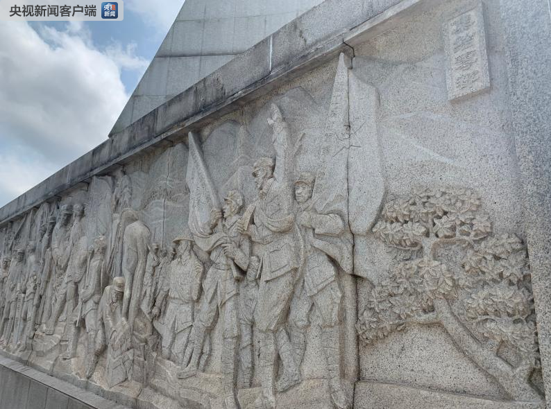△碑座上的三幅巨型浮雕,分别以“集结于都”、“渡河出发”、“倾情奉献”为主题。(央视记者张晓鹏拍摄)