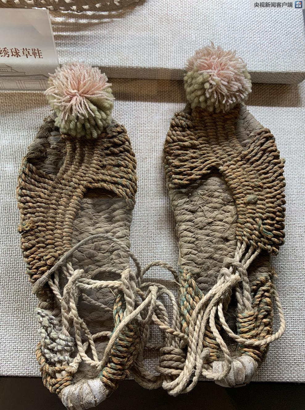 △红军战士谢志坚的一双草鞋。当年,他的心上人春秀姑娘得知谢志坚要随红军部队战斗转移远征,连夜用黄麻编织了这双草鞋。解放后,谢志坚从甘肃回到于都工作,而春秀姑娘已被国民党杀害。他将草鞋捐赠给了纪念馆。草鞋上的红心绣球,是谢志坚为纪念春秀姑娘特意绑上去的。(央视记者郭晗光拍摄)