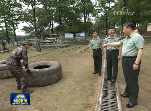 学院训练场上,学员们生龙活虎、喊声震天,一派实战化练兵景象。习近平走到障碍训练场旁,察看学员进行障碍训练情况。极限训练对于锤炼学员体能极限、意志极限、心理极限,提高战场适应能力很有意义。习近平步行进入极限训练场,详细了解有关训练设施和训练情况。学员们进行了阻绝墙跳水、翻越懒人梯、跨越步步高、翻越高墙、攀爬云梯、攀越高空荡木桥、扛圆木等训练。看到学员们摸爬滚打一身泥水,迎着障碍一往无前,习近平很高兴。