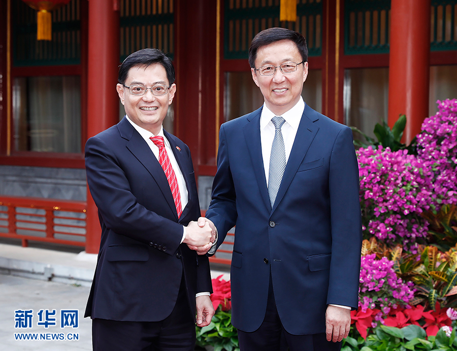 韩正表示,中方高度重视中新关系,明年两国将迎来建交30周年,双方要以此为契机,推动中新关系在新时期实现更大发展。中方愿同新方一道,落实好两国领导人共识,继续用好合作机制平台,推动各领域务实合作取得更大发展。双方要保持密切沟通,高质量共建“一带一路”,建设好“陆海新通道”,深化第三方市场合作,开展粤港澳大湾区建设合作,发挥示范和带动效应,推动地区和沿线国家共同发展。