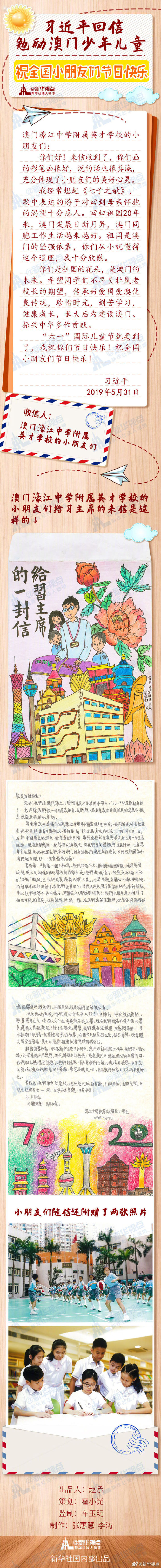 新华社北京6月1日电 在“六一”国际儿童节来临之际,国家主席习近平5月31日给澳门濠江中学附属英才学校的小学生回信,对他们予以亲切勉励,并祝他们和全国的少年儿童节日快乐。
