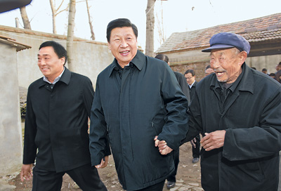 2013年11月25日下午,习近平在地处沂蒙老区的临沭县曹庄镇朱村亲切地拉着83岁的“老支前”王克昌的手去他家看望。新华社记者 谢环驰摄