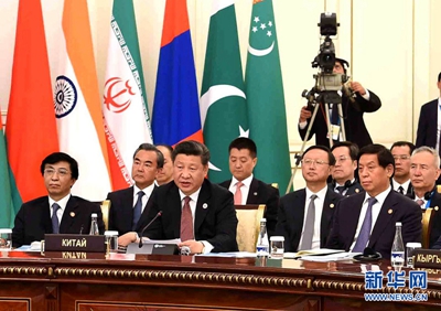 2017年6月9日,国家主席习近平在哈萨克斯坦首都阿斯塔纳出席上海合作组织成员国元首理事会第十七次会议并发表重要讲话。新华社记者 庞兴雷摄