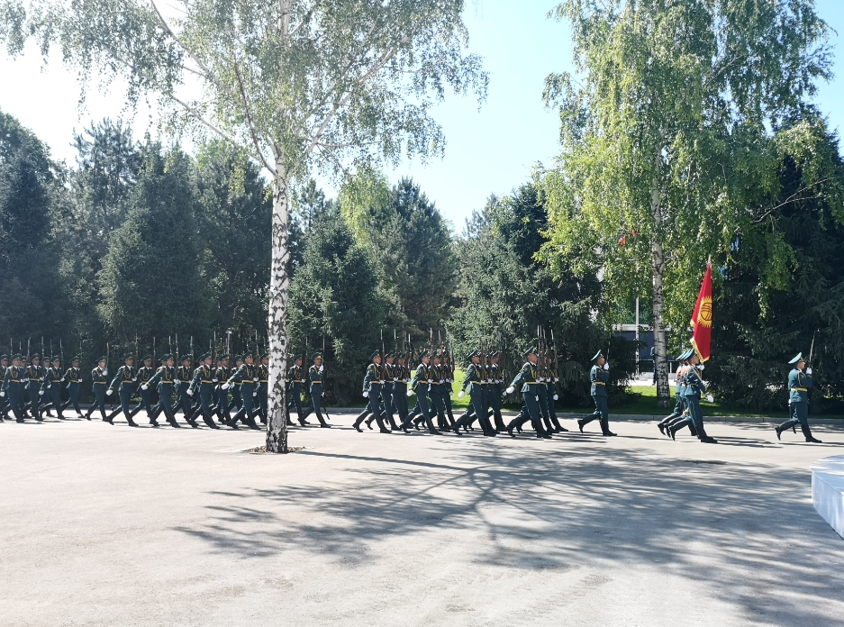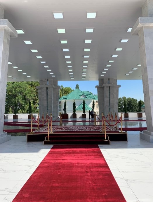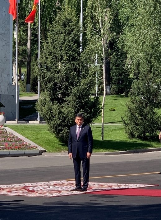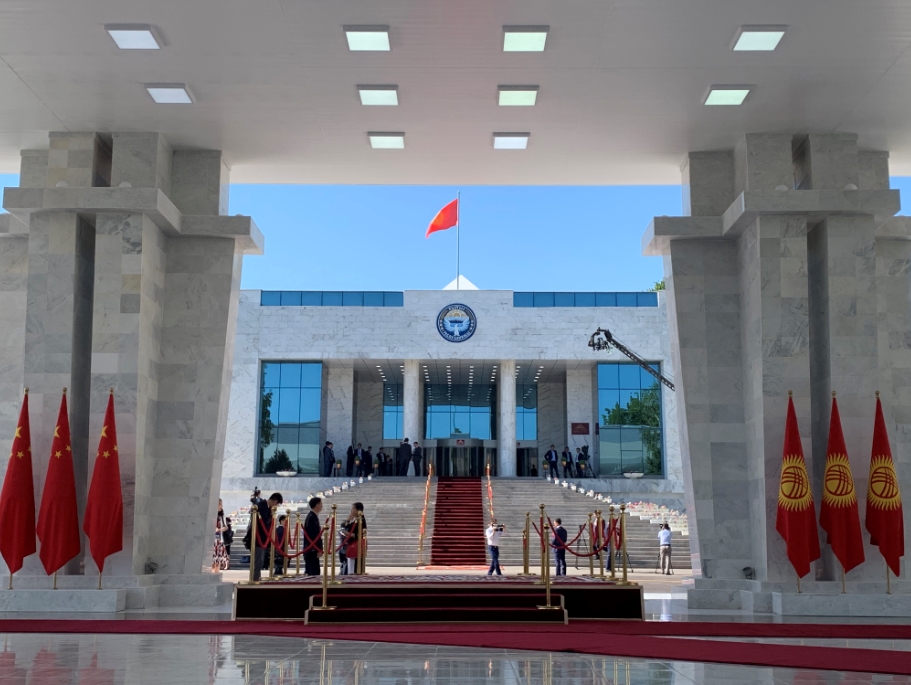 △阿拉尔恰国宾馆会议中心前广场,欢迎仪式即将开始。国宾馆会议中心是中方为吉方举办2007年上合组织峰会援建的,是该国重要会议的举办场所。