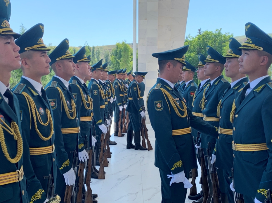 习近平行至仪仗队中央,用吉尔吉斯语向仪仗队员问候:战士们好!仪仗队员用吉尔吉斯语回答:欢迎您!