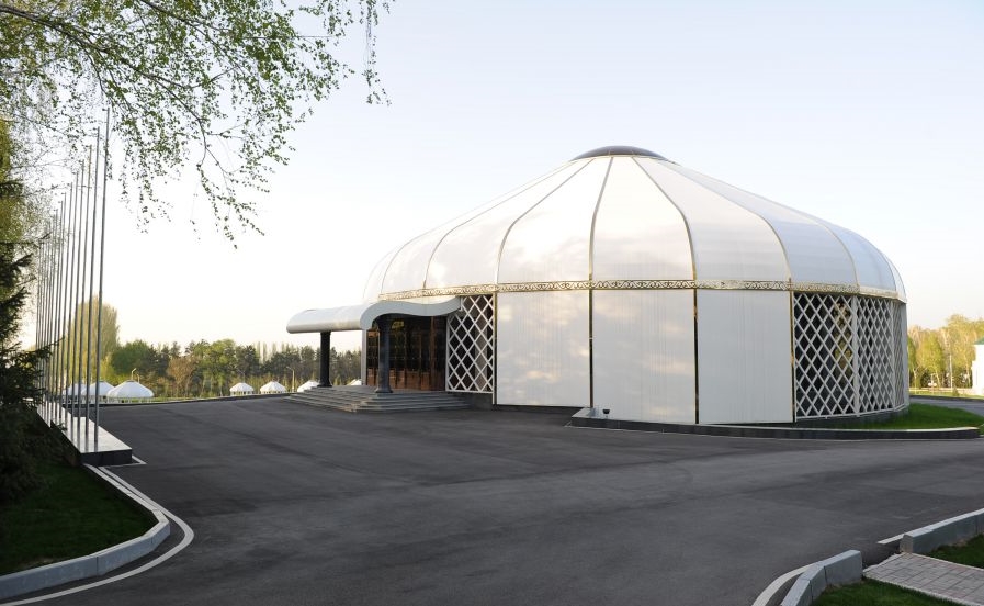 △阿拉尔恰国宾馆中的叶尼塞宴会厅。热恩别科夫在这里为习近平举行欢迎宴会。叶尼塞宴会厅是以传统毡房为原型而设计的。2017年,热恩别科夫总统的就职典礼就是在这里举行。(资料图)