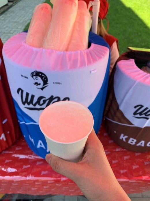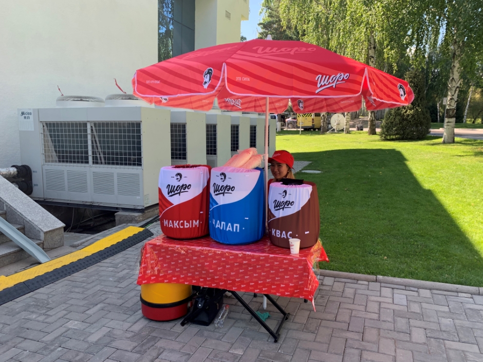 △工作人员把这样的饮料摊搬到国宾馆里,让客人免费品尝吉尔吉斯的“街饮”(马克瑟姆、酸奶、格瓦斯)。热情的吉国新闻官给《时政新闻眼》要了杯酸奶。