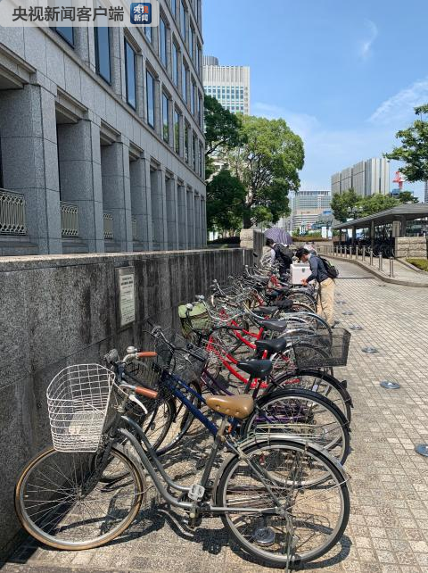 △在大阪市政府门口停放着的自行车。《时政新闻眼》发现,大阪很少见共享单车,基本都是自己所有(央视记者沈忱拍摄)