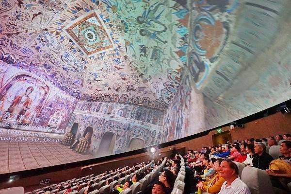 在莫高窟15余公里外,有一个形似沙丘、又如流水的土黄色流线型建筑。这是2014年建成的莫高窟数字展示中心,在这里,游客犹如置身飞船,观看球幕电影,感受着数字敦煌的神奇。游客也因此有序分流,有效降低对石窟的不利影响。