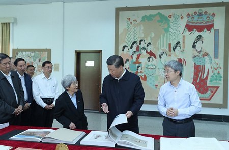 8月19日,中共中央总书记、国家主席、中央军委主席习近平来到敦煌研究院,察看珍藏文物和学术成果展示,并同有关专家、学者和文化单位代表座谈。 新华社记者 鞠鹏 摄