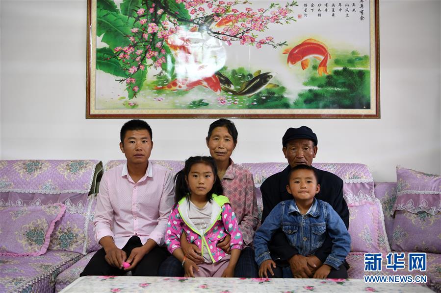 在武威市古浪县黄花滩生态移民区富民新村,村民李应川(右一)和家人合影留念(8月22日摄)。 新华社记者 范培珅 摄