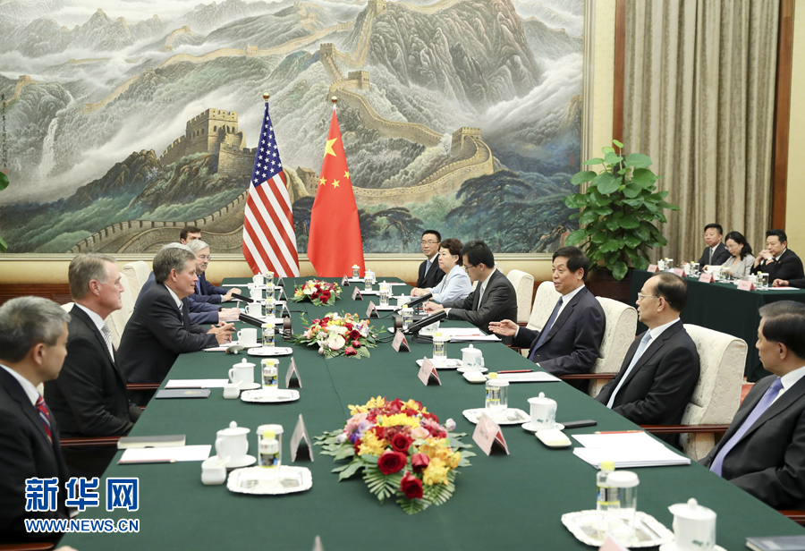 9月2日,全国人大常委会委员长栗战书在北京人民大会堂会见美国国会参议院“美中工作小组”共同主席、参议员戴恩斯和参议员珀杜一行。 新华社记者 丁海涛 摄