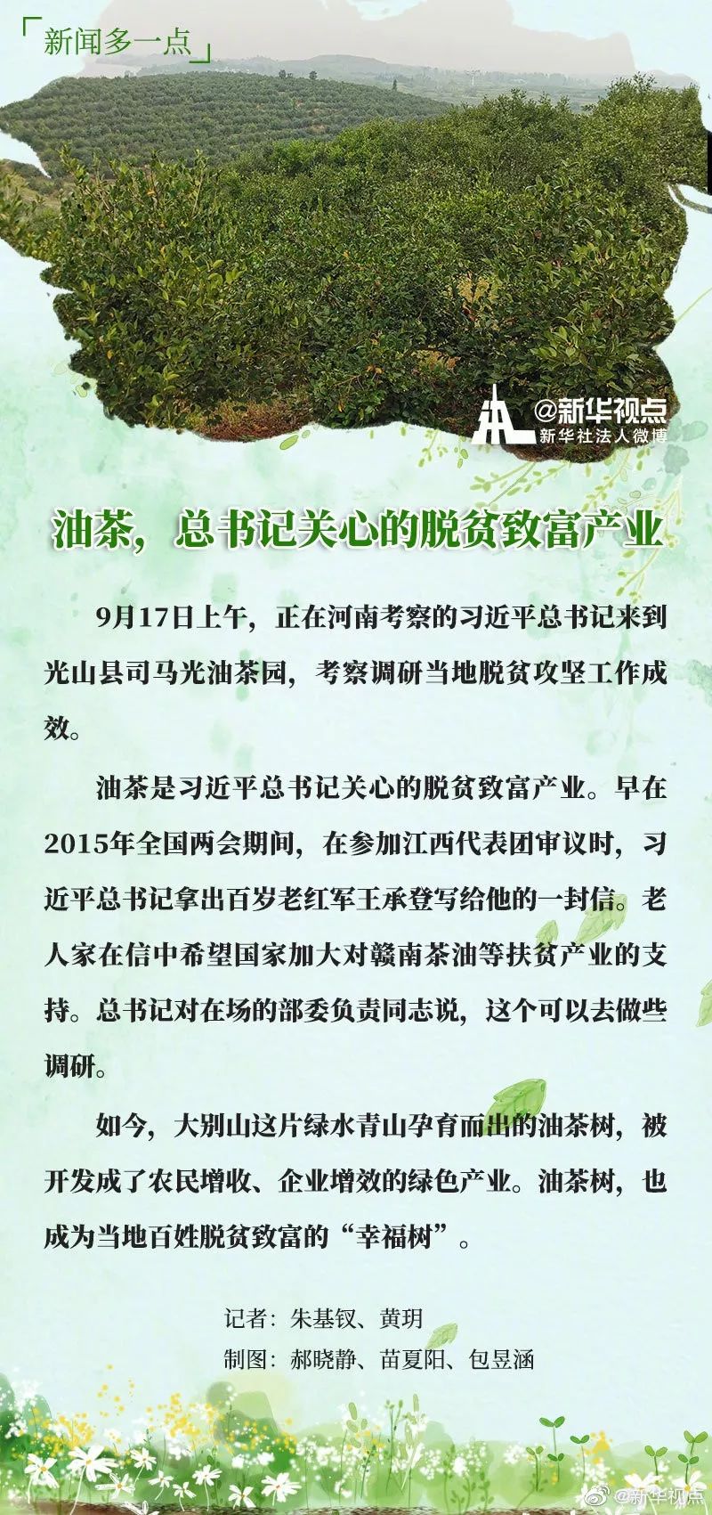 17日上午,习近平来到信阳市光山县槐店乡司马光油茶园,实地察看油茶树种植和挂果情况。